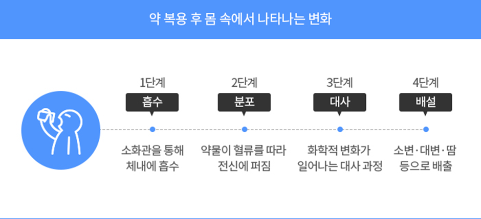 의약품이 우리 몸에 들어가고 나오는 과정을 4단계로 분류할 수 있는데, 이를 흡수, 분포, 대사, 배설 과정이라고 해요.